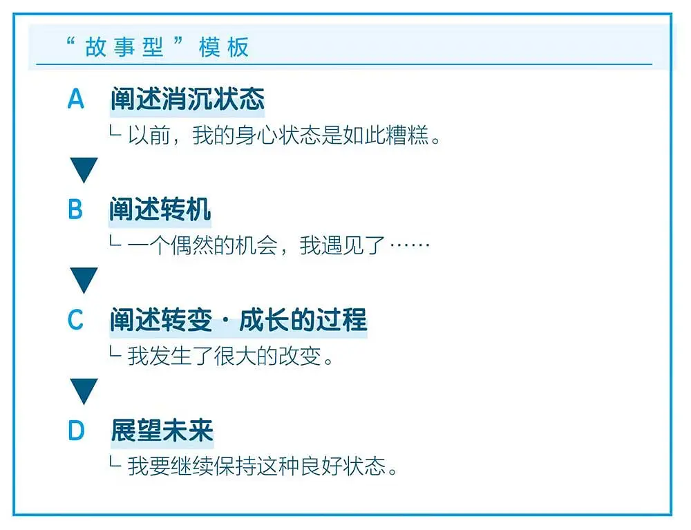- 写作顺序:消极状态 ➡️ 转机 ➡️ 成长过程 ➡️ 展望未来.